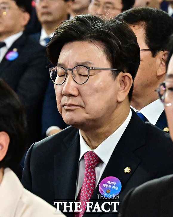 [더팩트ㅣ국회=배정한 기자] 권성동 국민의힘 원내대표가 4일 오전 11시 서울 여의도 국회 로텐더홀에서 열린 취임선서에 참석해 눈을 감고 있다.