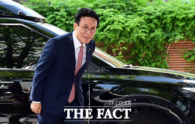 [더팩트ㅣ임영무 기자] 김민석 국무총리 후보자가 5일 오전 서울 종로구 통의동 금융감독원 연수원에 마련된 인사청문회 준비단 사무실로 출근해 인사를 하고 있다.darkroom@tf.co.kr사진영상기획부 photo@tf.co.kr