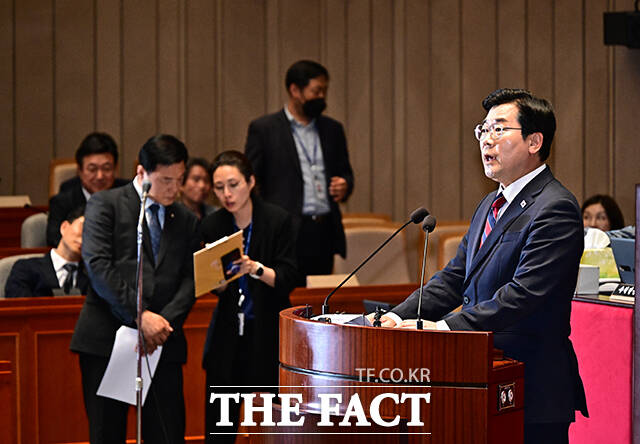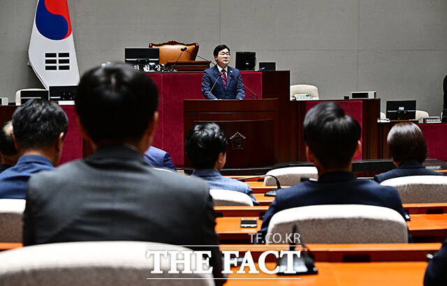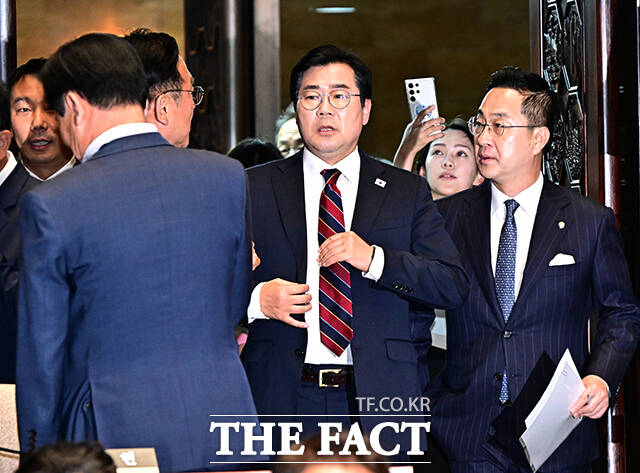 [더팩트ㅣ국회=배정한 기자] 박찬대 더불어민주당 대표 직무대행 겸 원내대표가 5일 오후 서울 여의도 국회에서 열린 의원총회에 참석해 모두발언을 하고 있다.