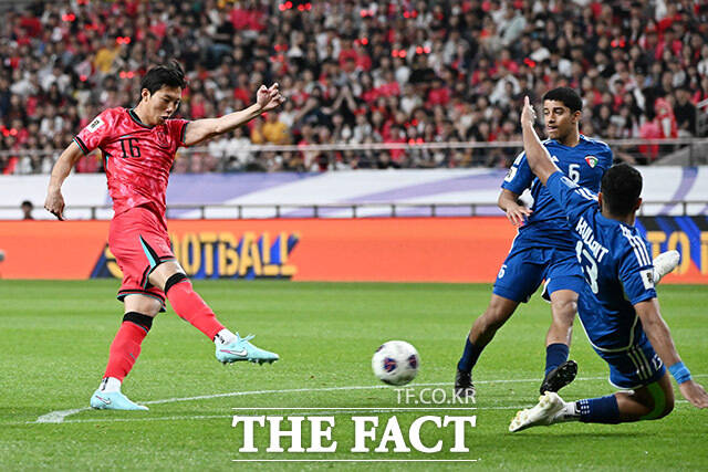[더팩트ㅣ서울월드컵경기장=남용희 기자] 이한범이 10일 오후 서울 마포구 서울월드컵경기장에서 열린 2026 국제축구연맹(FIFA) 북중미 월드컵 아시아 3차 예선 쿠웨이트전에서 슈팅을 시도하고 있다.