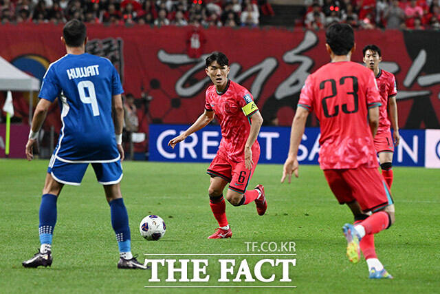 [더팩트ㅣ서울월드컵경기장=남용희 기자] 황인범(가운데)이 10일 오후 서울 마포구 서울월드컵경기장에서 열린 2026 국제축구연맹(FIFA) 북중미 월드컵 아시아 3차 예선 쿠웨이트전에서 드리블을 시도하고 있다.
