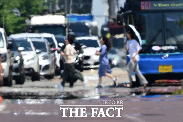 [더팩트ㅣ남윤호 기자] 서울 낮 최고기온이 32도까지 치솟은 12일 오후 서울 강서구 마곡동 공항대로 아스팔트 위로 아지랑이가 피어오르고 있다.