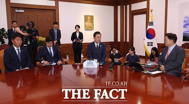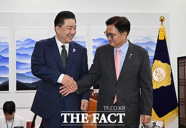 [더팩트ㅣ국회=배정한 기자] 김병기 더불어민주당 대표 직무대행 겸 원내대표(왼쪽)가 16일 오전 서울 여의도 국회에서 우원식 국회의장을 예방해 기념촬영을 하고 있다.