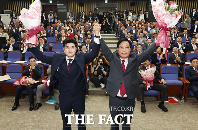 [더팩트ㅣ국회=배정한 기자] 송언석 국민의힘 신임 원내대표가 16일 오후 서울 여의도 국회에서 열린 국민의힘 원내대표 선출 의원총회에서 김용태 비상대책위원장(왼쪽)과 함께 인사를 하고 있다.