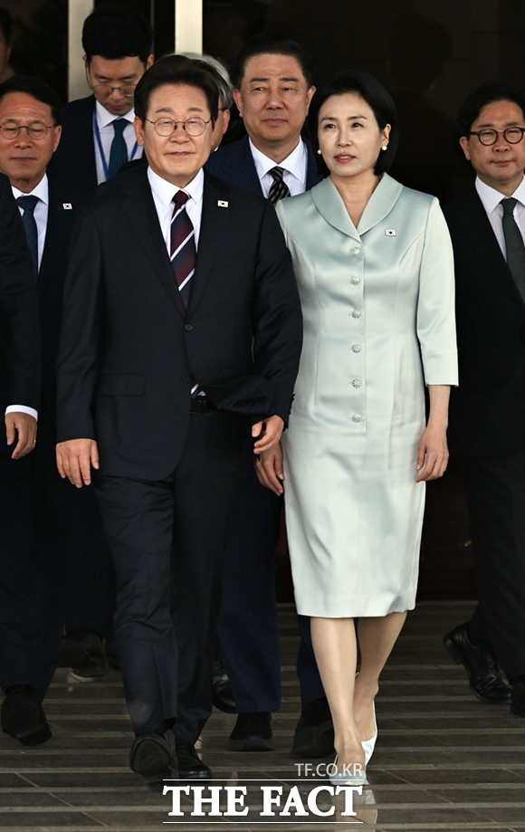 [더팩트ㅣ서울공항=이새롬 기자] 주요 7개국(G7) 정상회의 참석을 위한 첫 해외 순방길에 나선 이재명 대통령과 김혜경 여사가 16일 오후 경기 성남시 서울공항에 도착해 공군 1호기로 향하고 있다.