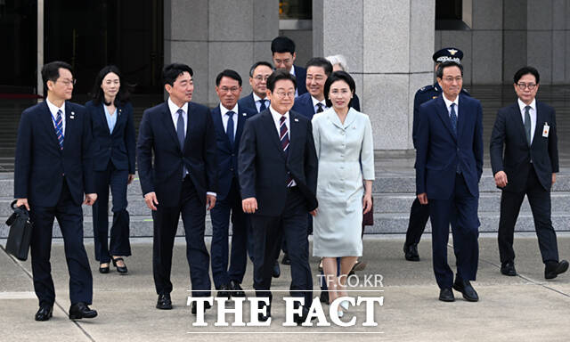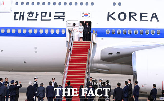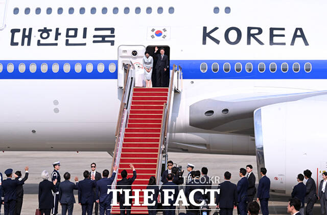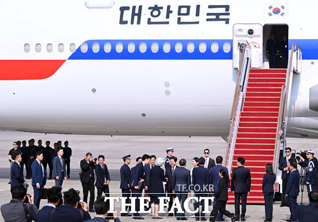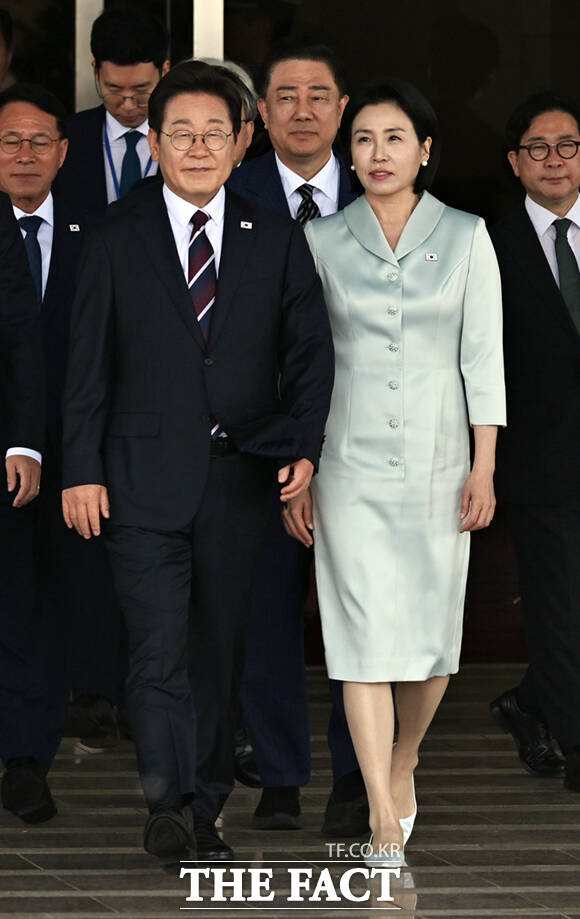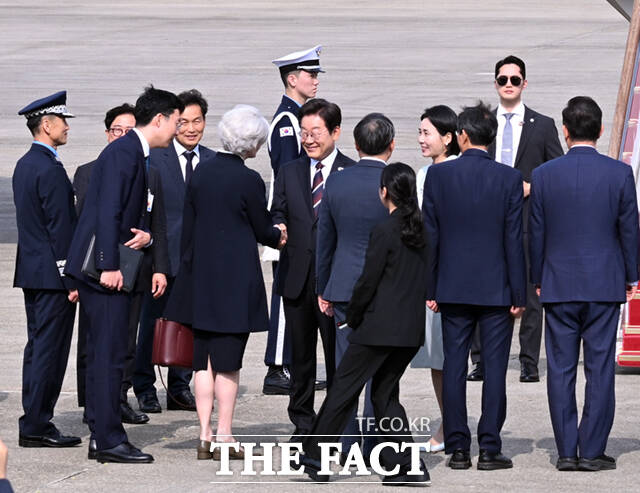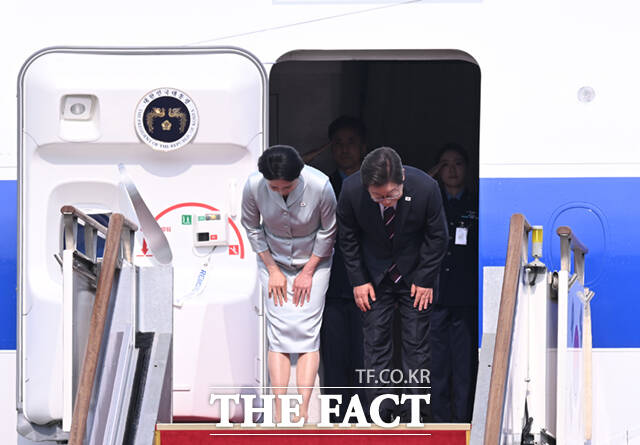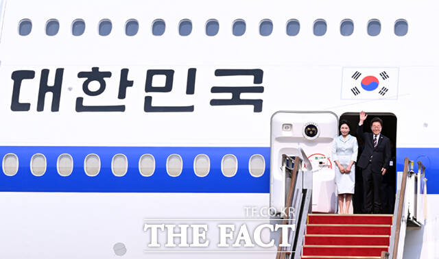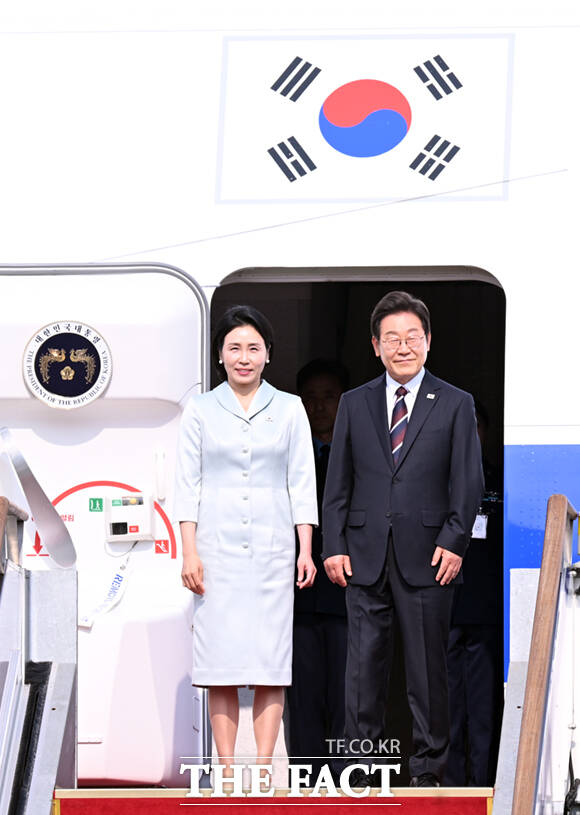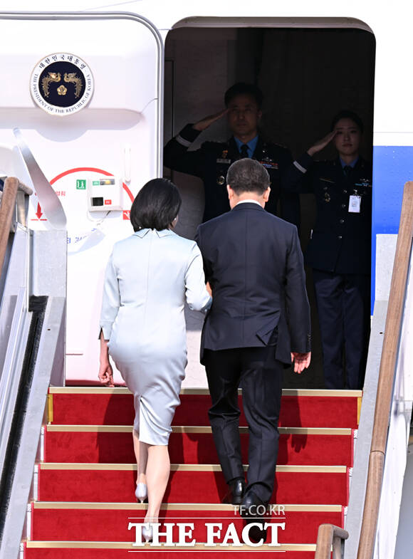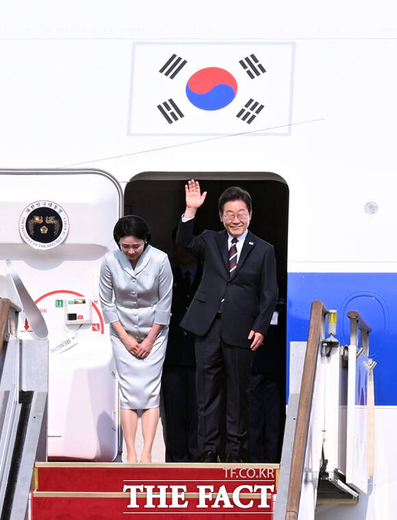 [더팩트ㅣ서울공항=이새롬 기자] 주요 7개국(G7) 정상회의 참석을 위한 첫 해외 순방길에 나선 이재명 대통령과 김혜경 여사가 16일 오후 경기 성남시 서울공항에 도착해 공군 1호기에 올라 인사하고 있다.