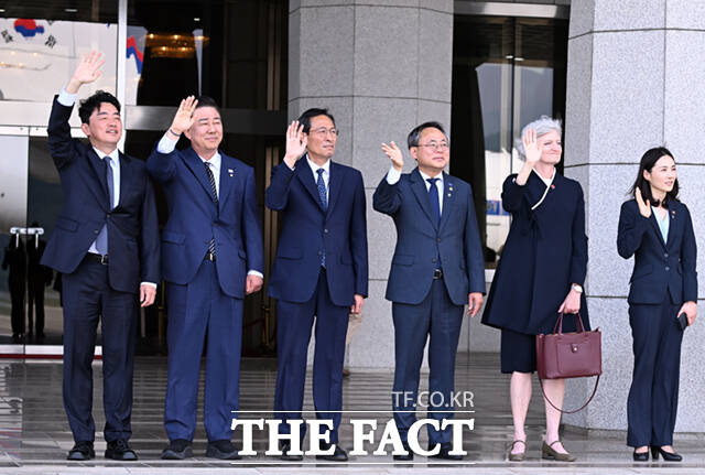 강훈식 비서실장과 김병기 더불어민주당 대표 직무대행 겸 원내대표, 우상호 대통령실 정무수석, 고기동 행정안전부 장관 직무대행, 타마라 모휘니 주한 캐나다 대사, 김진아 외교부 2차관(오른쪽부터)이16일 오후 경기 성남시 서울공항에서 G7 정상회의 참석을 위해 순방길에 오른 이재명 대통령을 배웅하며 손을 흔들고 있다. /서울공항=이새롬 기자