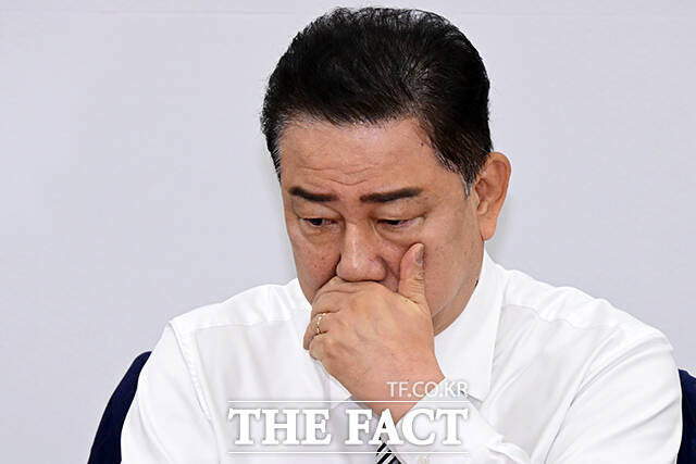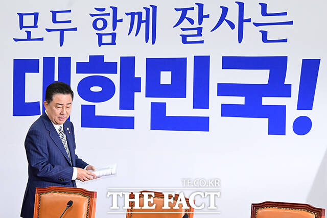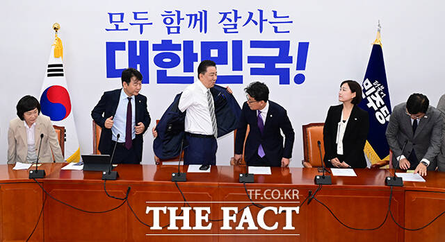 [더팩트ㅣ국회=남윤호 기자] 김병기 더불어민주당 대표 직무대행 겸 원내대표가 17일 오전 서울 여의도 국회에서 열린 원내대책회의에서 발언에 앞서 외투를 벗고 있다.