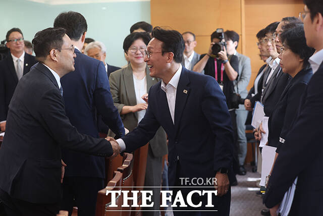 [더팩트ㅣ임영무 기자] 김민석 국무총리 후보자(가운데)가 17일 오전 서울 종로구 통의동 금융감독연수원에 마련된 청문회 준비단에서 열린 사회분야 부처 업무보고에 참석해 관계자들과 인사를 나누고 있다.