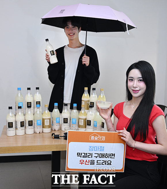 [더팩트ㅣ박헌우 기자] 17일 오전 서울 서초구 느린마을양조장 양재본점에서 모델들이 홈술닷컴 '장마에는 빗소리와 막걸리' 프로모션 행사를 홍보하고 있다.