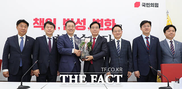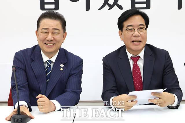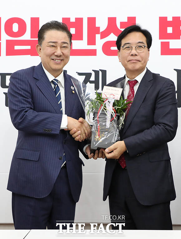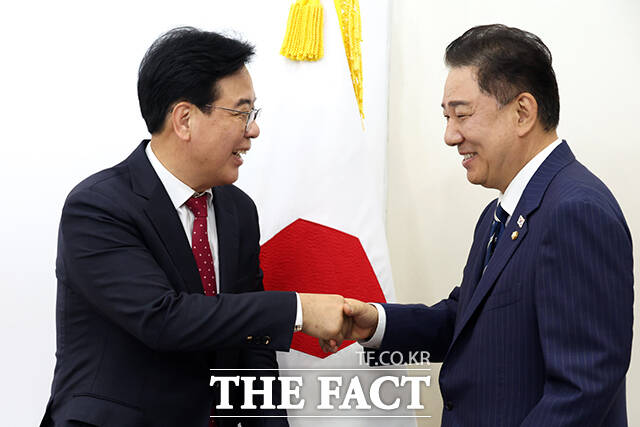 [더팩트ㅣ국회=남윤호 기자] 김병기 더불어민주당 원내대표(오른쪽)가 17일 오후 서울 여의도 국회에서 송언석 국민의힘 원내대표를 예방해 악수하고 있다.