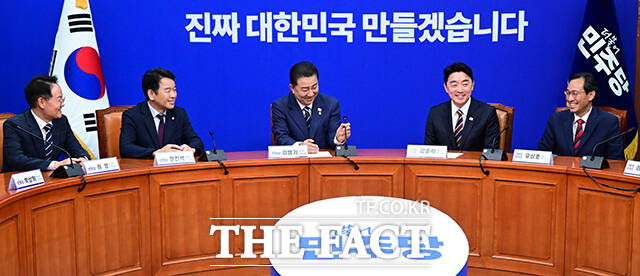 [더팩트ㅣ국회=남윤호 기자] 김병기 더불어민주당 대표 직무대행 겸 원내대표가 17일 오후 서울 여의도 국회에서 강훈식 대통령 비서실장, 우상호 대통령실 정무수석을 접견하며 기념촬영을 하고 있다.