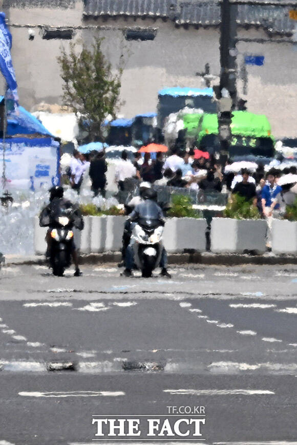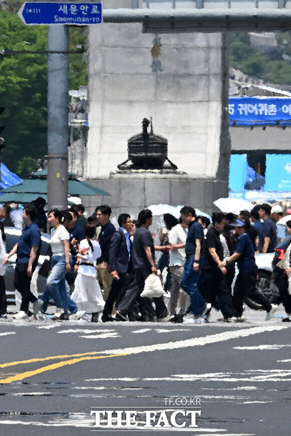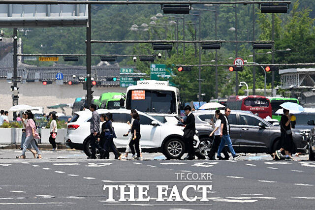 [더팩트ㅣ남용희 기자] 낮 최고기온이 30도 안팎의 무더위가 예고된 18일 오후 서울 광화문 일대에 지열로 인한 아지랑이가 피어오르고 있다.