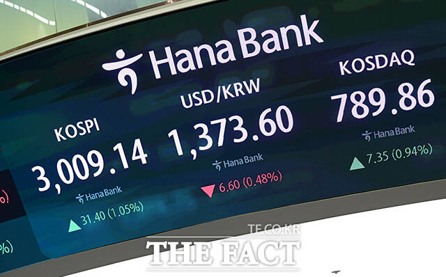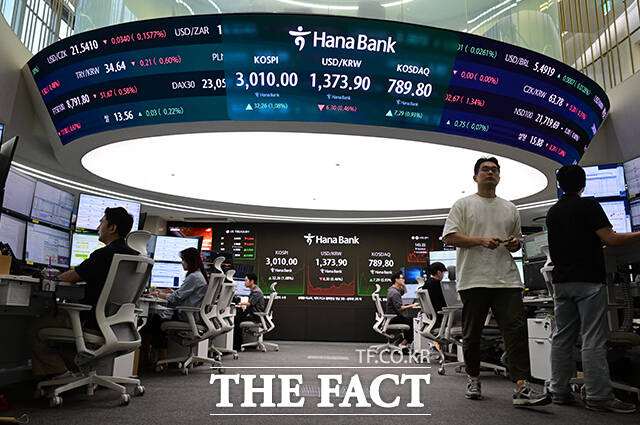 [더팩트ㅣ임영무 기자] 코스피가 장중 3000선을 돌파한 20일 오전 서울 중구 하나은행 딜링룸 모니터에 코스피가 전 거래일 대비 32.42포인트 상승한 3010.16을 나타내고 있다.