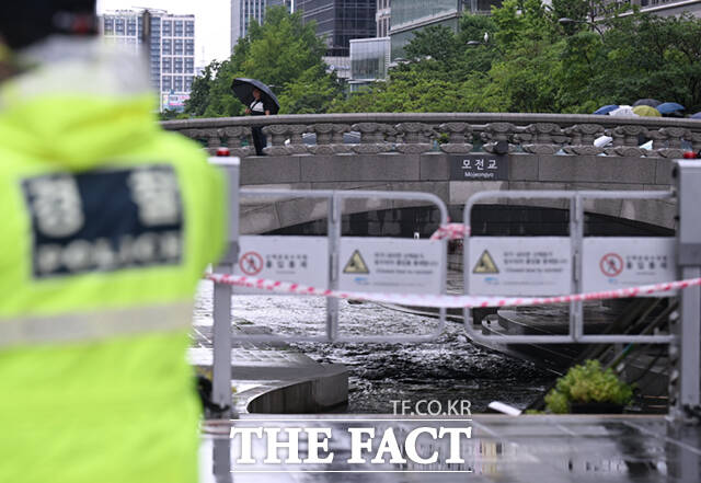 [더팩트ㅣ이새롬 기자] 서울과 경기·인천에 각각 호우주의보, 호우경보가 발령된 20일 오전 서울 청계천 산책로 출입이 통제돼 있다.