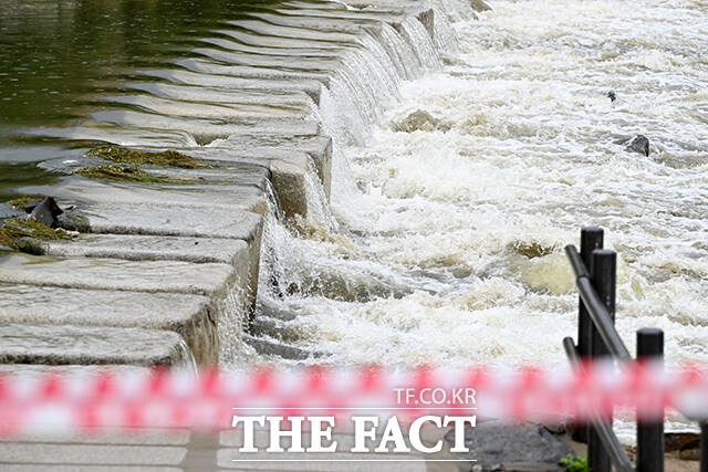 [더팩트ㅣ서예원 기자] 서울과 경기를 비롯한 수도권 곳곳에 호우주의보와 호우경보가 발령된 20일 오전 서울 구로구 안양천 징검다리 출입이 통제돼 있다.