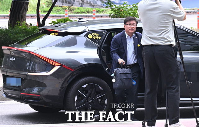 [더팩트ㅣ이새롬 기자] 환경부 장관 후보자로 지명된 김성환 더불어민주당 의원이 24일 오전 서울 여의도 이룸센터에 도착해 전기차에서 내리고 있다.