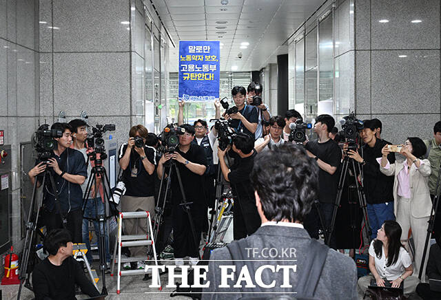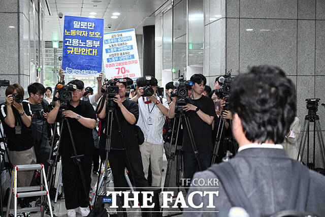 [더팩트ㅣ박헌우 기자] 김영훈 고용노동부 장관 후보자가 24일 오후 서울 중구 서울지방고용노동청에 마련된 인사청문회 준비 사무실에 출근한 가운데 민주노총 금속노조 주얼리분회 조합원이 김 후보자를 향해 '불법사업장에 대한 조사를 해 달라'며 피켓을 들고 호소하고 있다.