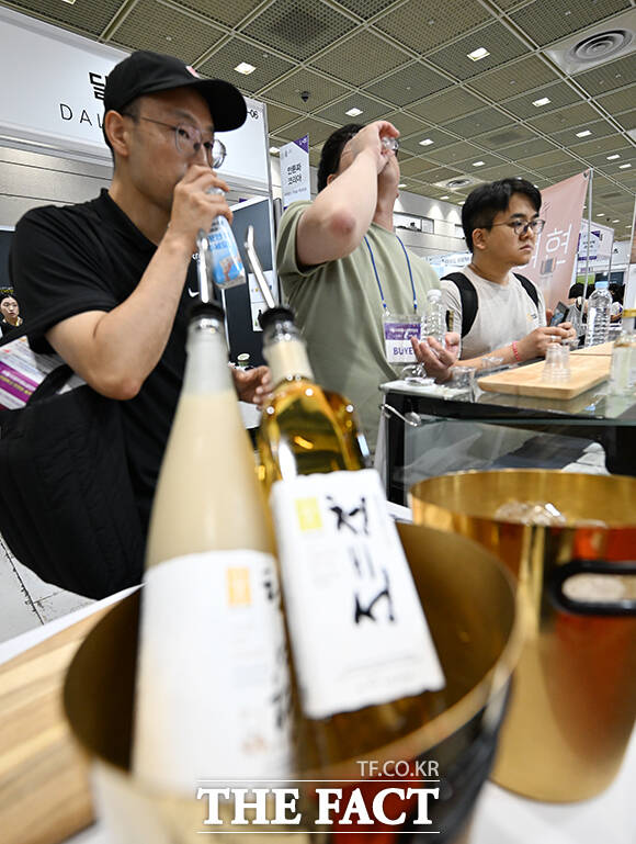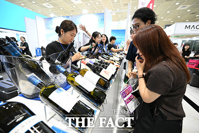 [더팩트ㅣ장윤석 기자] '2025 서울국제주류&와인박람회'가 26일 오전 서울 강남구 코엑스에서 열린 가운데 관람객들이 와인을 시음하고 있다.