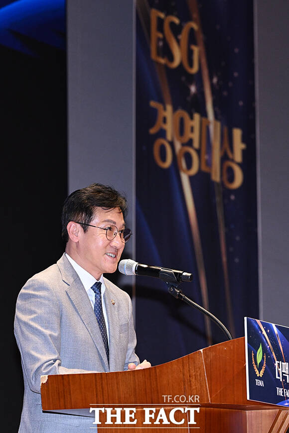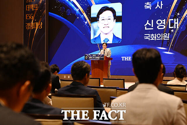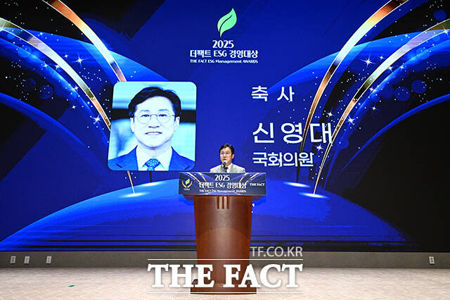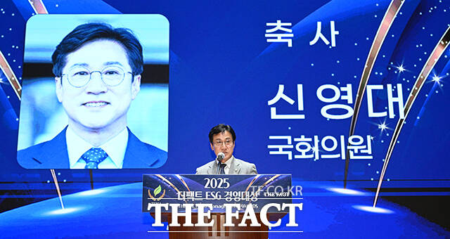 [더팩트ㅣ박헌우·장윤석·서예원 기자] 특종에 강한 신개념 대중 종합지 <더팩트>가 주최하는 '2025 ESG 경영대상' 시상식이 26일 오후 서울 영등포구 여의도 한국거래소(KRX) 컨퍼런스홀에서 열려 신영대 더불어민주당 의원이 축사를 하고 있다.
