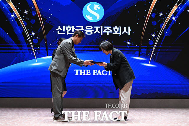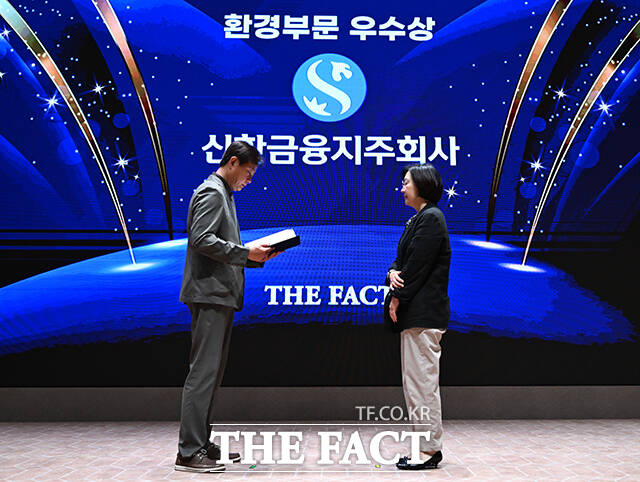 [더팩트ㅣ장윤석 기자] '2025 ESG 경영대상' 시상식이 26일 오후 서울 영등포구 여의도 한국거래소(KRX) 컨퍼런스홀에서 열린 가운데, 신한금융지주가 환경부문 우수상을 수상했다. 정재웅 더팩트 편집국장(왼쪽)이 이은하 부장에게 상패를 수여한 뒤 기념 촬영을 하고 있다.