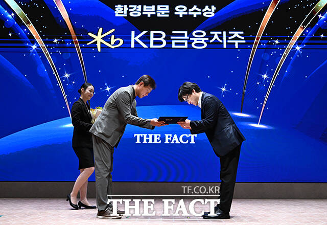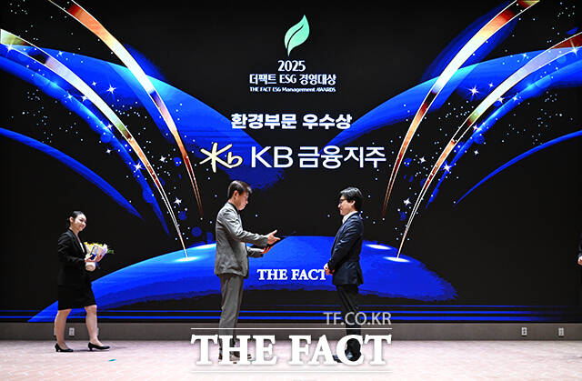 [더팩트ㅣ장윤석 기자] '2025 ESG 경영대상' 시상식이 26일 오후 서울 영등포구 여의도 한국거래소(KRX) 컨퍼런스홀에서 열린 가운데, KB 금융지주가 환경부문 우수상을 수상했다. 정재웅 더팩트 편집국장(왼쪽)이 김재규 팀장에게 상패를 수여한 뒤 기념 촬영을 하고 있다.