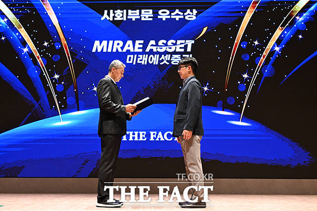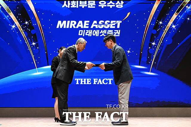 [더팩트ㅣ서예원 기자] '2025 ESG 경영대상' 시상식이 26일 오후 서울 영등포구 여의도 한국거래소(KRX) 컨퍼런스홀에서 열린 가운데, 미래에셋증권이 사회부문 우수상을 수상했다. 이영근 대외협력국장(왼쪽)이 미래에셋증권 강한성 실장에게 상패를 수여한 뒤 기념촬영을 하고 있다.