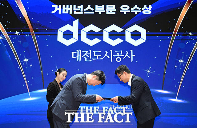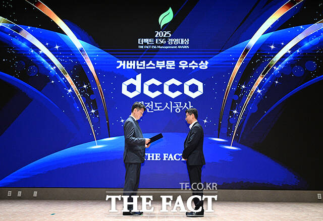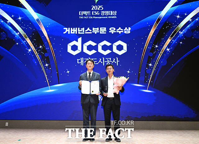 [더팩트ㅣ박헌우 기자] 특종에 강한 신개념 대중 종합지 <더팩트>가 주최하는 '2025 ESG 경영대상' 시상식이 26일 오후 서울 영등포구 여의도 한국거래소(KRX) 컨퍼런스홀에서 열려 성강현 더팩트 부국장(왼쪽)이 김용선 대전도시공사 팀장에게 시상 후 기념촬영을 하고 있다.