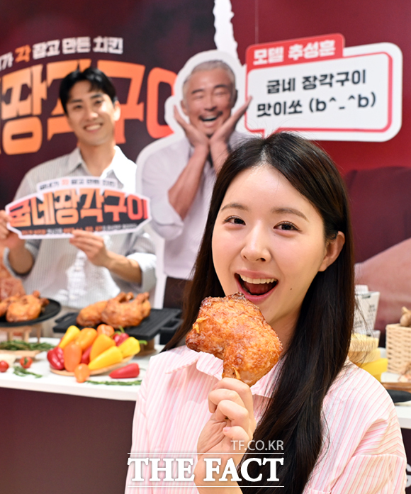 [더팩트ㅣ이새롬 기자] 오븐요리 프랜차이즈 굽네치킨을 운영하는 지앤푸드가 신제품 '굽네 장각구이'를 출시하고 격투기 선수 추성훈을 모델로 발탁한 가운데, 1일 오전 서울 마포구 굽네 플레이타운에서 열린 출시 기념 행사에서 모델들이 굽네 장각구이를 들고 포즈를 취하고 있다.