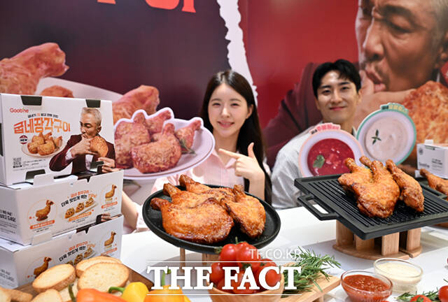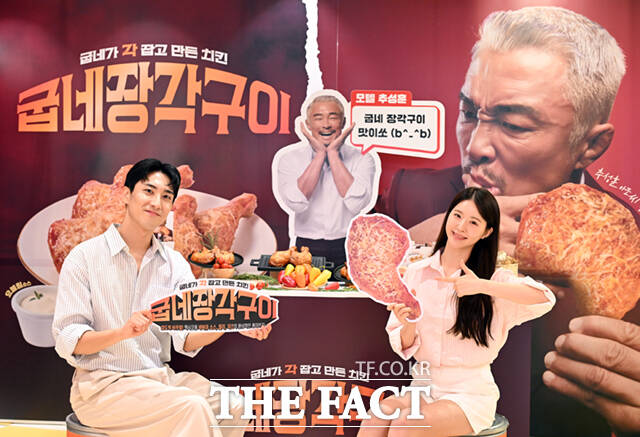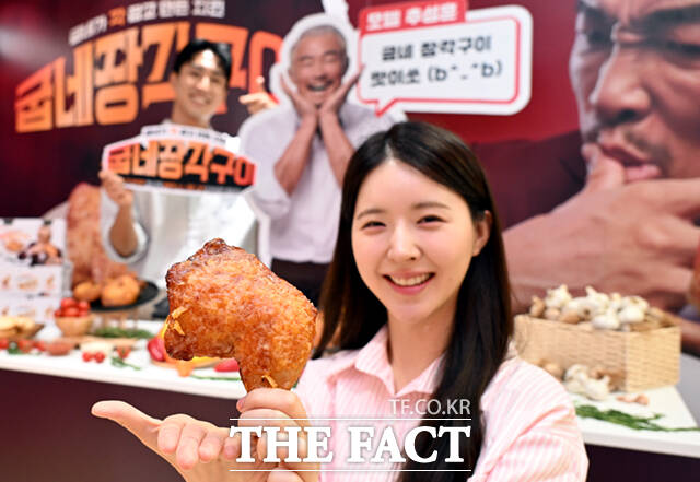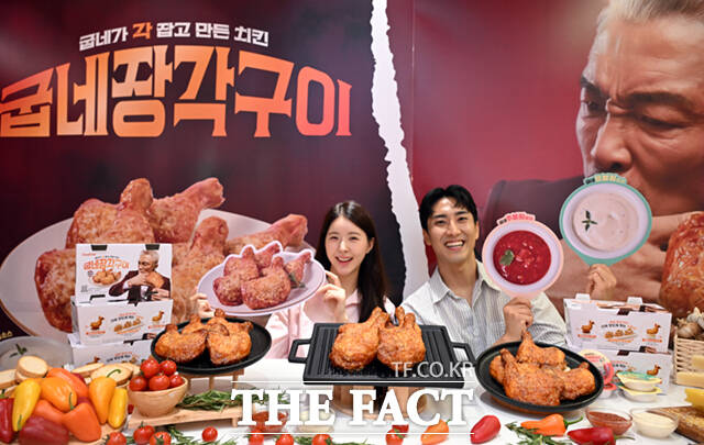 [더팩트ㅣ이새롬 기자] 오븐요리 프랜차이즈 굽네치킨을 운영하는 지앤푸드가 신제품 '굽네 장각구이'를 출시하고 격투기 선수 추성훈을 모델로 발탁한 가운데, 1일 오전 서울 마포구 굽네 플레이타운에서 열린 출시 기념 행사에서 모델들이 굽네 장각구이를 들고 포즈를 취하고 있다.