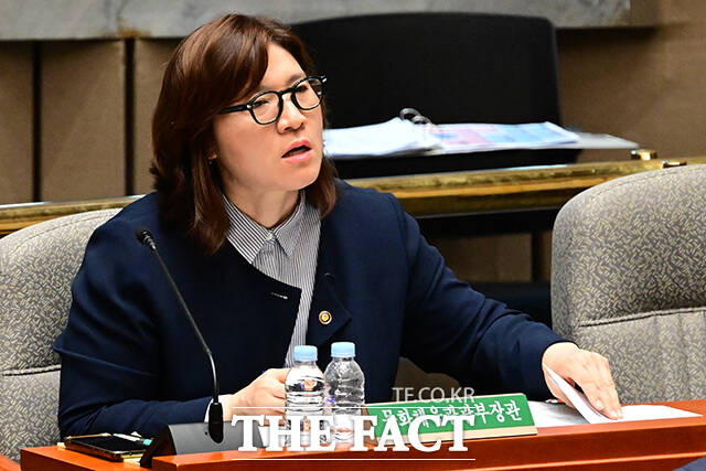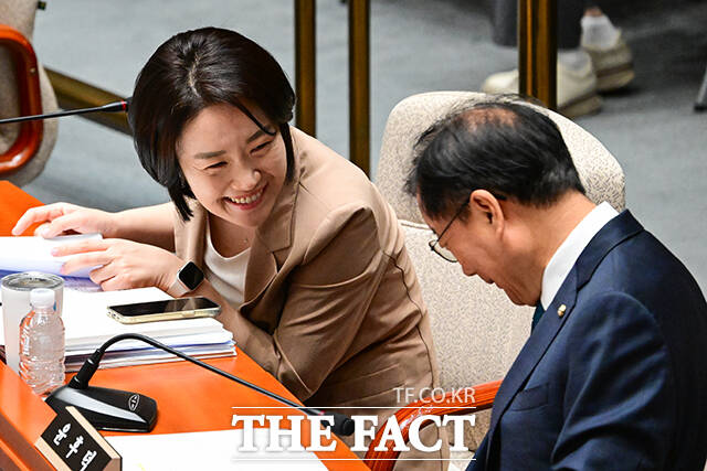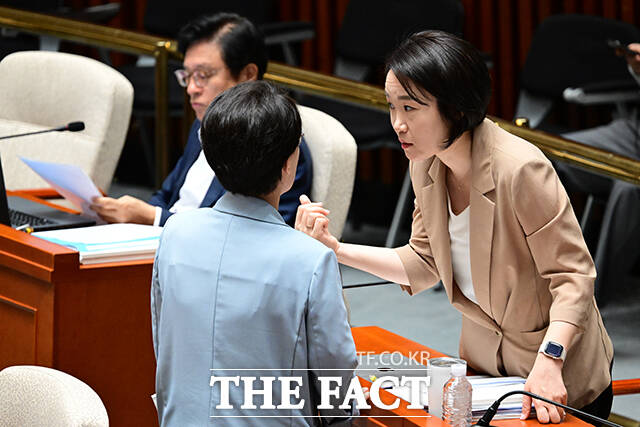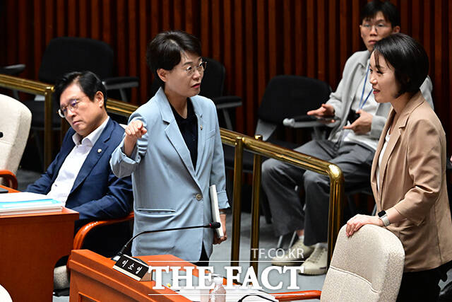 이날 여야 간사인 이소영 더불어민주당 의원(오른쪽)과 박형수 국민의힘 의원이 이야기 하는 모습.