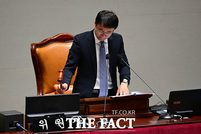 [더팩트ㅣ국회=남윤호 기자] 1일 오전 서울 여의도 국회에서 예산결산특별위원회 전체회의를 앞둔 한병도 위원장이 시간을 확인하고 있다.