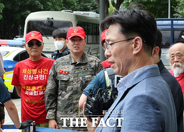 [더팩트ㅣ박헌우 기자] 임성근 전 해병대 1사단장이 2일 오후 서울 서초구에 마련된 채상병 특검팀 사무실에 출석하며 입장을 밝히고 있는 가운데 해병대 예비역연대 관계자들이 임 전 사단장을 바라보고 있다.