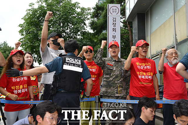 [더팩트ㅣ박헌우 기자] 임성근 전 해병대 1사단장이 2일 오후 서울 서초구에 마련된 채상병 특검팀 사무실에 출석하며 입장을 밝히고 있는 가운데 해병대 예비역연대원들이 항의하고 있다.cjg05023@tf.co.kr사진영상기획부 photo@tf.co.kr