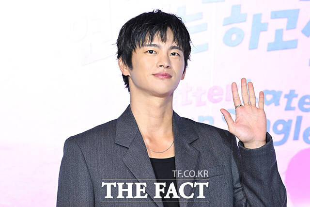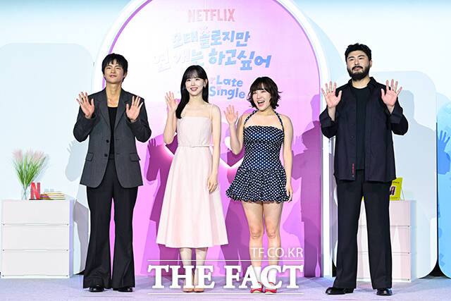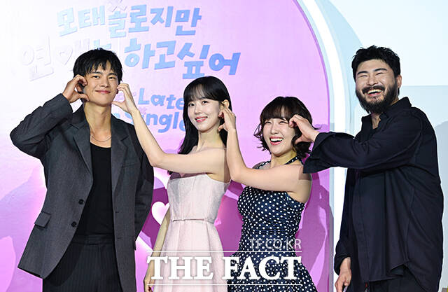 [더팩트ㅣ서예원 기자] 배우 서인국과 강한나, 조욱형 PD, 김노은 PD, 원승재 PD, 개그우먼 이은지, 가수 카더가든(왼쪽부터)이 3일 오전 서울 용산구 CGV 용산아이파크몰에서 열린 넷플릭스 예능 '모태솔로지만 연애는 하고 싶어' 제작발표회에 참석해 포즈를 취하고 있다.