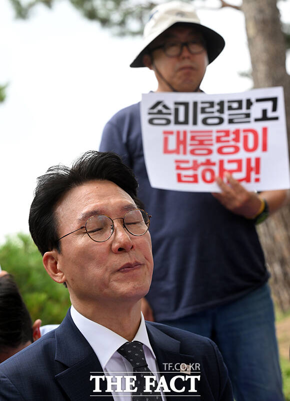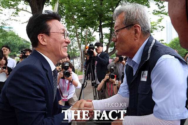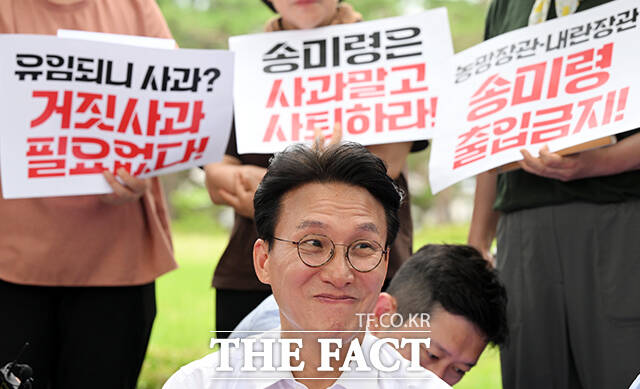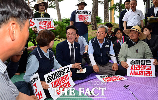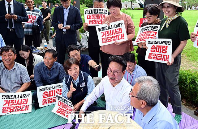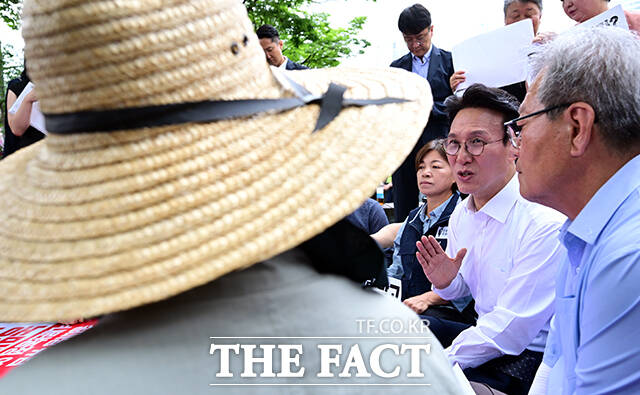 [더팩트ㅣ임영무 기자] 김민석 신임 국무총리가 첫 공식일정으로 4일 오전 서울 용산구 대통령실 앞 농민단체 항의 집회 현장을 찾아 면담을 갖고 있다.
