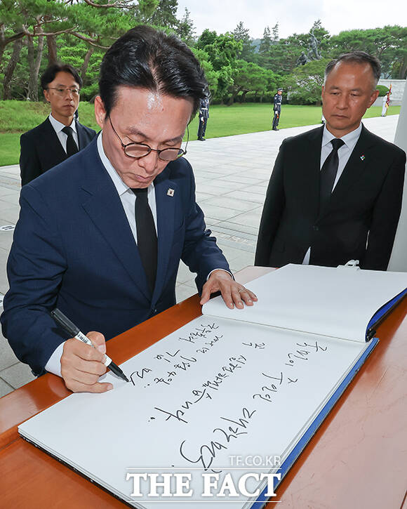 [더팩트ㅣ임영무 기자] 김민석 신임 국무총리가 4일 오후 서울 동작구 국립서울현충원 현충탑을 참배를 마치고 방명록을 작성하고 있다.