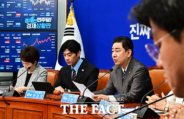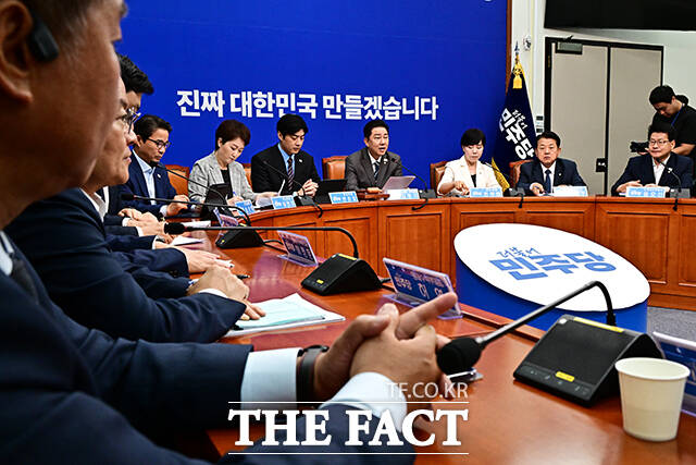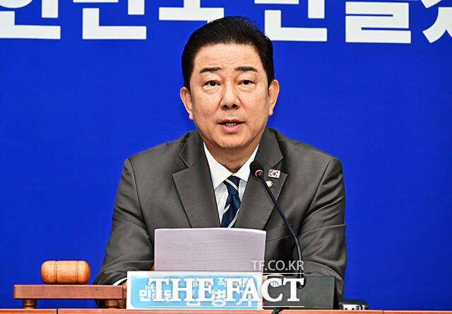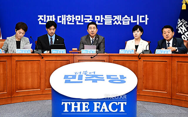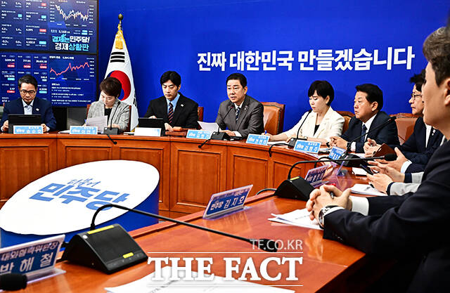 [더팩트ㅣ국회=배정한 기자] 김병기 더불어민주당 당대표 직무대행 겸 원내대표(가운데)가 7일 오전 서울 여의도 국회에서 열린 최고위원회의에 참석해 모두발언을 하고 있다.