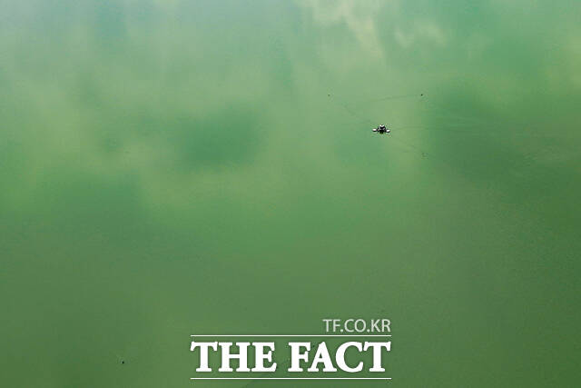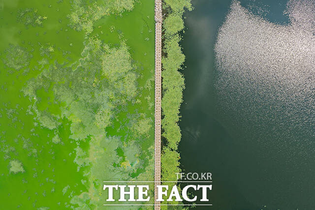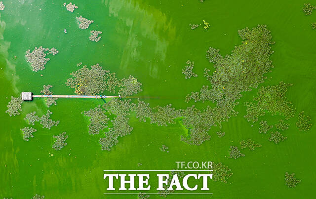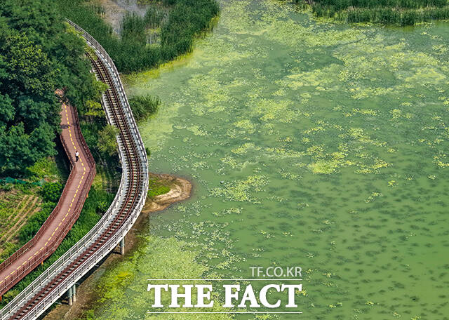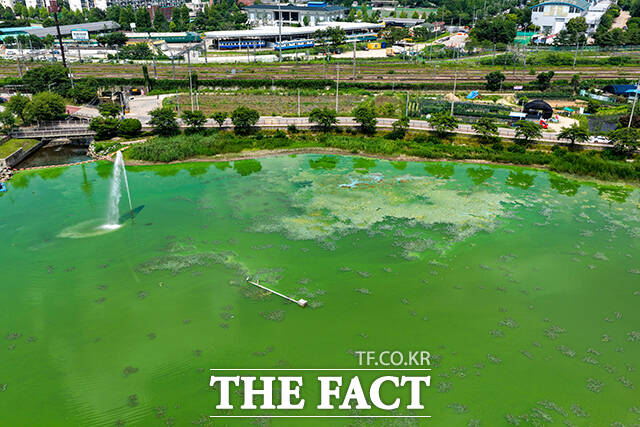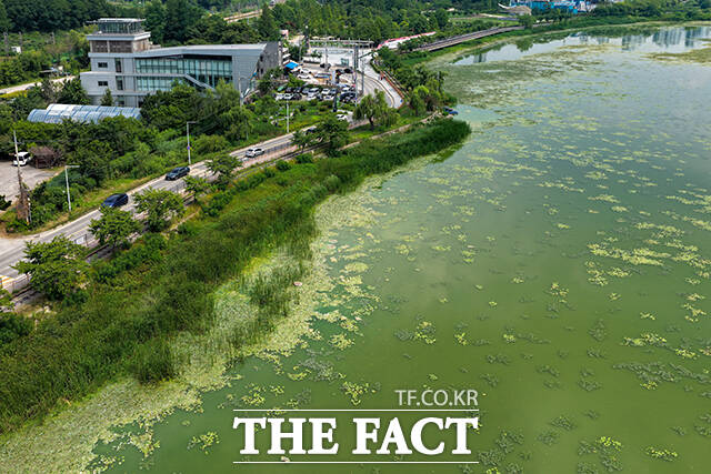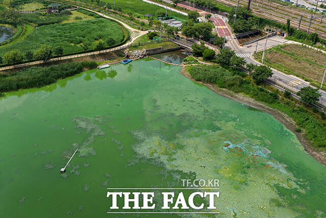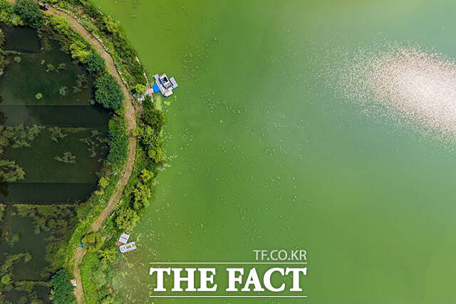 [더팩트ㅣ의왕=장윤석 기자] 전국 대부분 지역에 폭염특보가 내려진 8일 오후 경기도 의왕시 왕송호수가 녹조로 인해 초록빛을 띄고 있다.