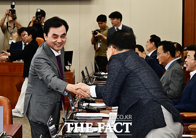 [더팩트ㅣ국회=배정한 기자] 국방부 장관 후보자로 지명된 안규백 더불어민주당 의원(왼쪽)이 9일 오전 서울 여의도 국회에서 열린 기획재정위원회 전체회의에 참석해 야당 의원들과 인사를 하고 있다.hany@tf.co.kr사진영상기획부 photo@tf.co.kr