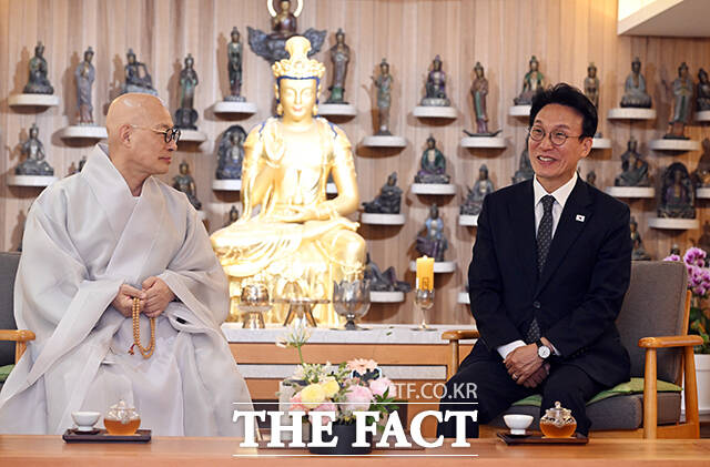 [더팩트ㅣ임영무 기자] 김민석 국무총리(오른쪽)가 10일 오전 서울 종로구 조계종 조계사 관음전에서 진우 조계종 총무원장을 예방하고 있다.
