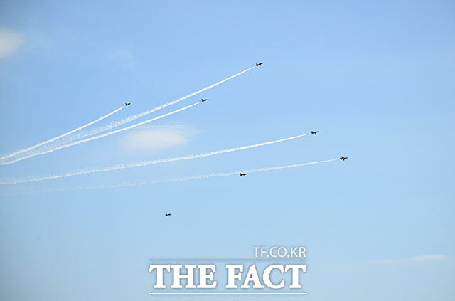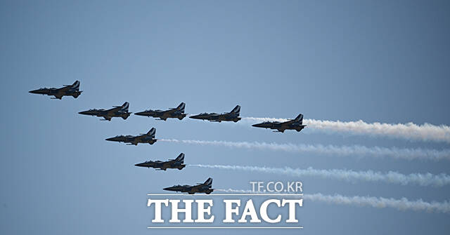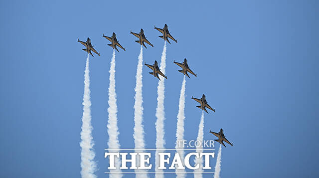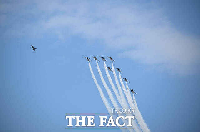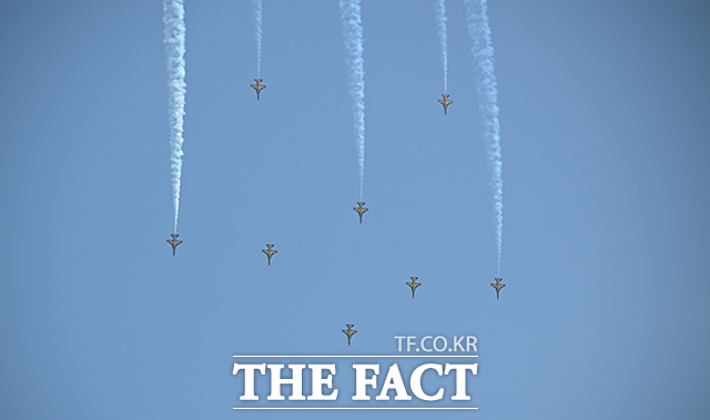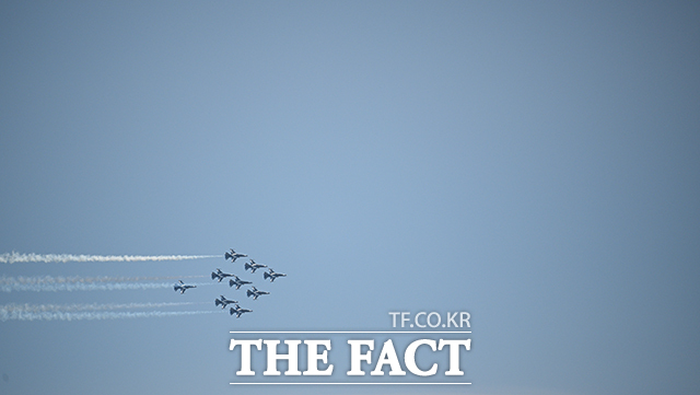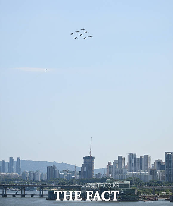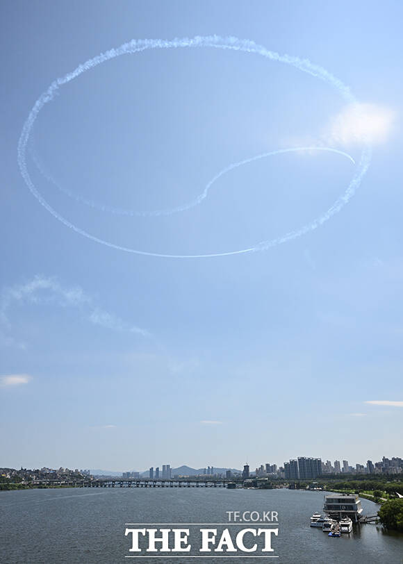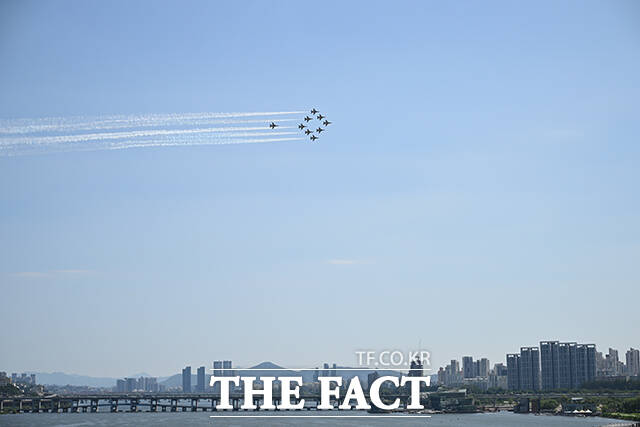 [더팩트ㅣ박헌우 기자] 공군 특수비행팀 블랙이글스가 10일 오전 서울 서초구 세빛섬 일대 상공에서 '제1회 방위산업의 날 에어쇼를 위한 사전훈련을 하고 있다.