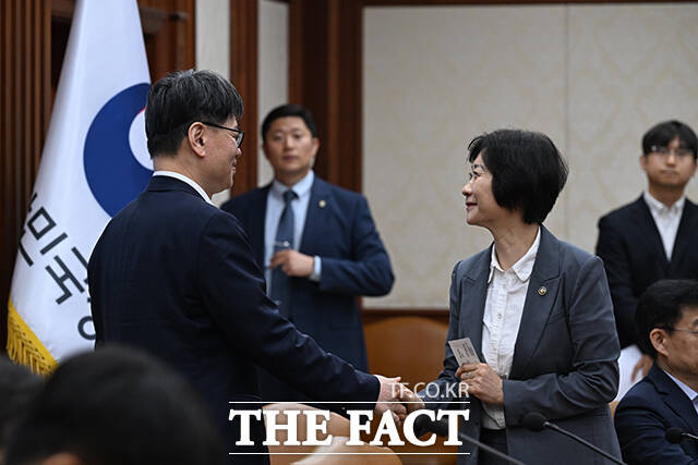 [더팩트ㅣ임영무 기자] 이스란 보건복지부 1차관(오른쪽)이 10일 오전 서울 종로구 정부서울청사에서 열린 국정현안관계장관회의에 참석해 회의 참석자들과 인사를 나누고 있다.darkroom@tf.co.kr사진영상기획부 photo@tf.co.kr