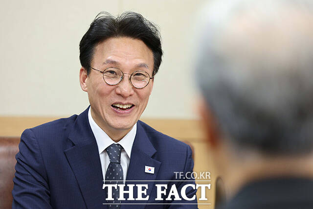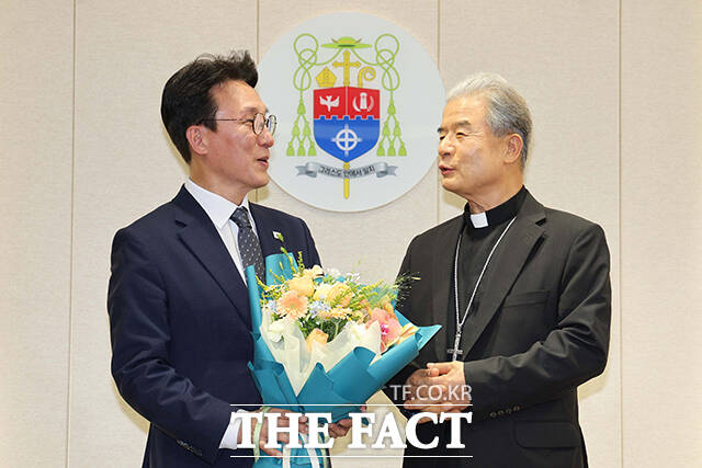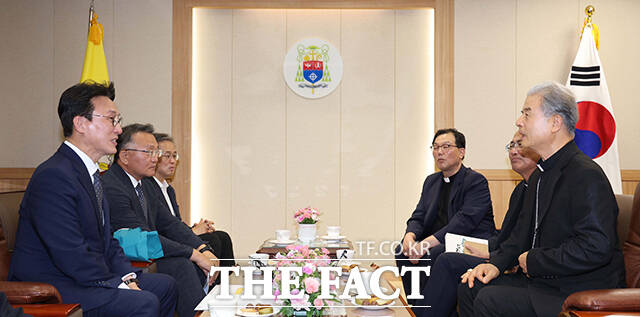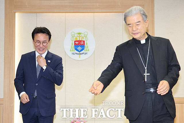 [더팩트ㅣ임영무 기자] 김민석 국무총리(왼쪽)가 10일 오후 경기 수원시 천주교수원교구청을 찾아 한국천주교주교회의 의장인 이용훈 주교를 예방하고 있다.