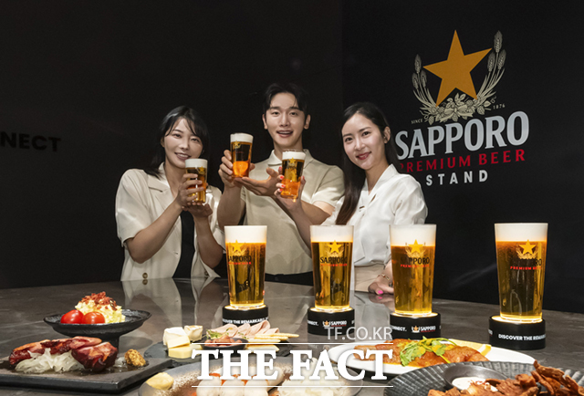 [더팩트ㅣ이새롬 기자] 삿포로 프리미엄 비어스탠드 매장이 오픈을 앞둔 10일 서울 성동구 매장에서 모델들이 삿포로 프리미엄 맥주를 들고 포즈를 취하고 있다.