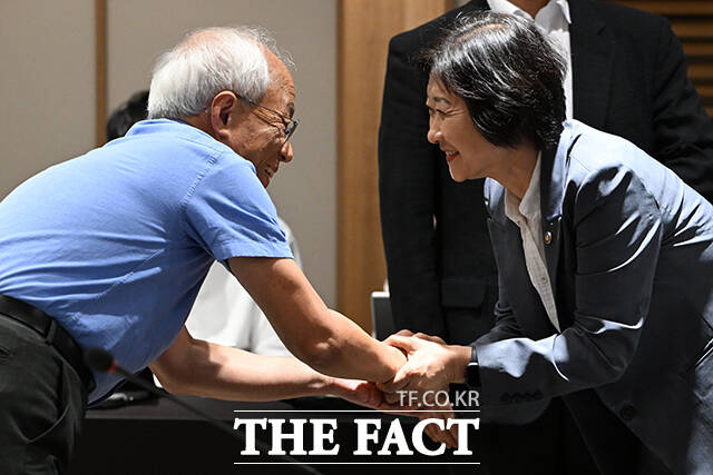 [더팩트ㅣ서예원 기자] 이스란 보건복지부 제1차관(오른쪽)이 10일 오후 서울 용산구 피스앤파크 컨벤션에서 열린 '의료급여제도 시민단체 집담회'에 참석해 사회를 맡은 김창엽 서울대 보건대학원 교수와 악수를 하고 있다.