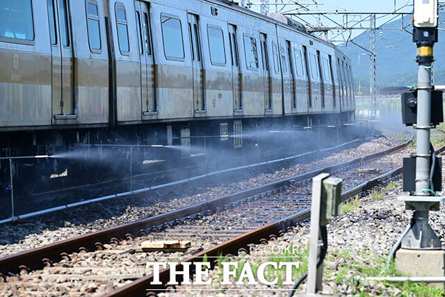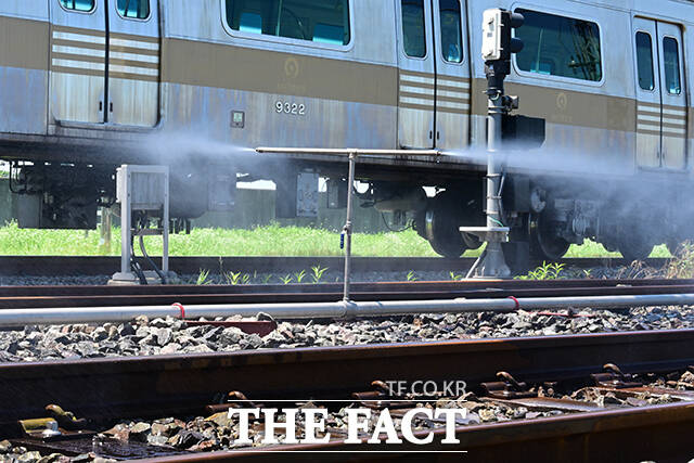 [더팩트ㅣ남윤호 기자] 11일 오전 서울 강서구 9호선 개화 차량기지에서 철도 온도가 48도를 넘으면 자동살수 되는 '레일살수 장치'가 가동되고 있다.