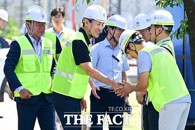 [더팩트ㅣ남윤호 기자] 폭염 대비 현장점검에 나선 오세훈 서울시장(가운데)이 11일 오전 서울 강서구 9호선 개화 차량기지를 찾아 레일살수장치 등 현장점검에 앞서 관계자들과 인사하고 있다.