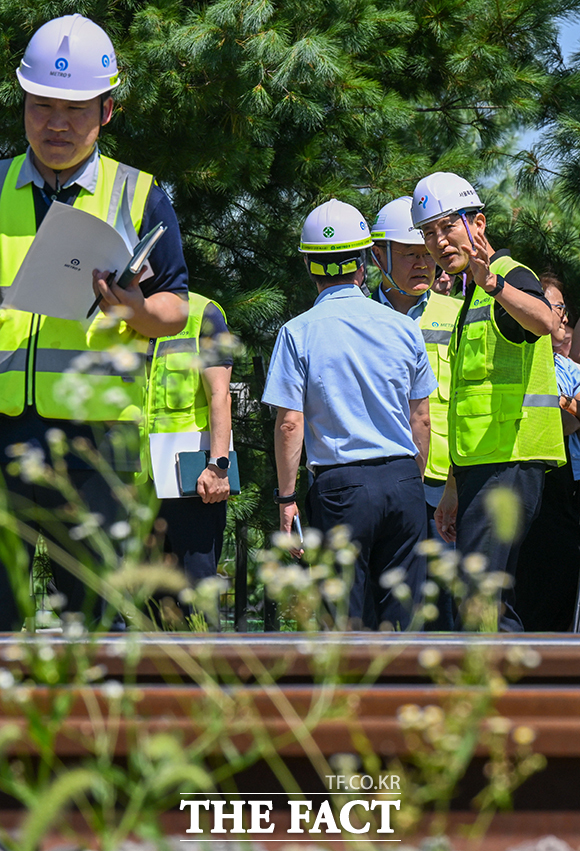 [더팩트ㅣ남윤호 기자] 폭염 대비 현장점검에 나선 오세훈 서울시장이 11일 오전 서울 강서구 9호선 개화 차량기지를 찾아 레일살수장치 등에 대한 점검에 앞서 관계자와 대화하고 있다.