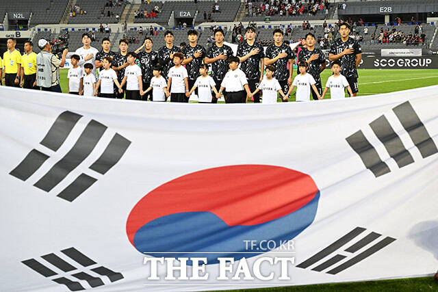 [더팩트ㅣ용인미르스타디움=남용희 기자] 대한민국과 홍콩의 동아시아축구연맹(EAFF) E-1 챔피언십(동아시안컵) 경기가 11일 오후 경기 용인시 용인미르스타디움에서 열린 가운데 선수단이 국기에 대한 경례를 하고 있다.